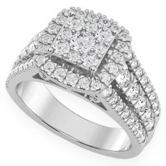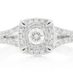 - The split shank double halo engagement ring showcases a total weight of 1.00ctw VS diamonds.