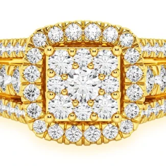 - The split shank double halo engagement ring showcases a total weight of 1.00ctw VS diamonds.