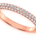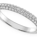 - Thin pave set diamond band featuring three rows of diamonds that curve around the front of the ring.